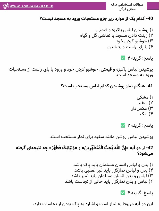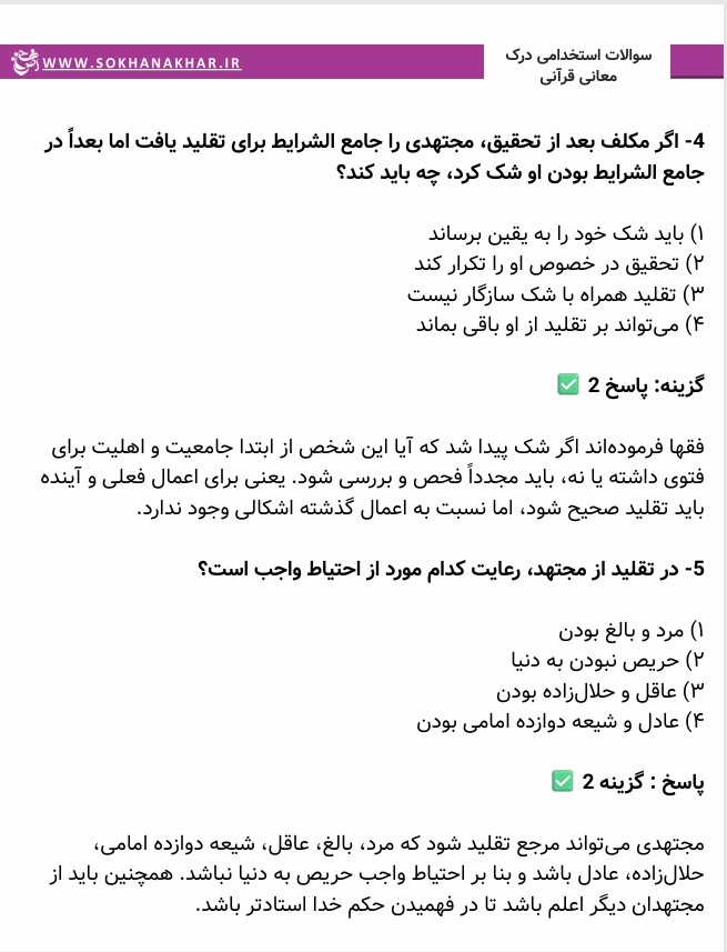 نمونه ای از تست ها و سوالات احکام و درک معانی قرآنی